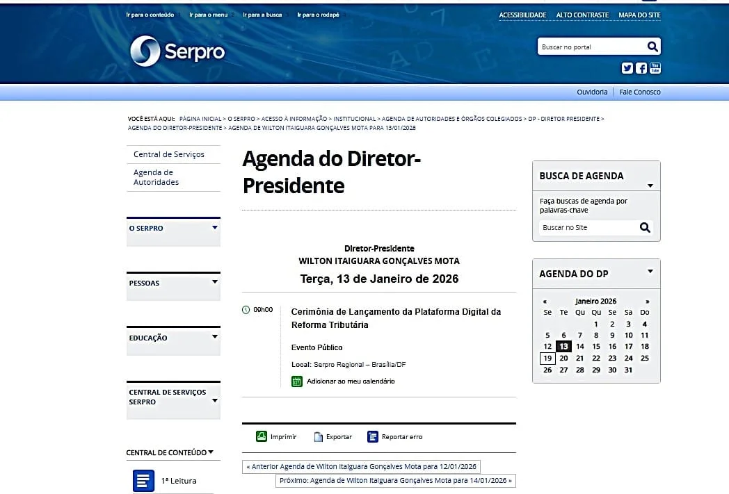 Foi nesta data que o Serpro lançou a plataforma da Reforma Tributária com a inédita presença de um presidente da República e o vice-presidente, Geraldo Alckmin, nos seus 60 anos de história. Além da participação dos ministros da Fazenda, Planejamento, Casa Civil, Relações Institucionais, Gestão, Trabalho e Emprego. Ainda contou com a presença do presidente da Câmara, Hugo Mota, que também prestigiou o lançamento da plataforma. Um detalhe: eventos que contam com a presença do presidente normalmente são realizados no Palácio do Planalto e não nas dependências de uma empresa estatal ou ministérios.