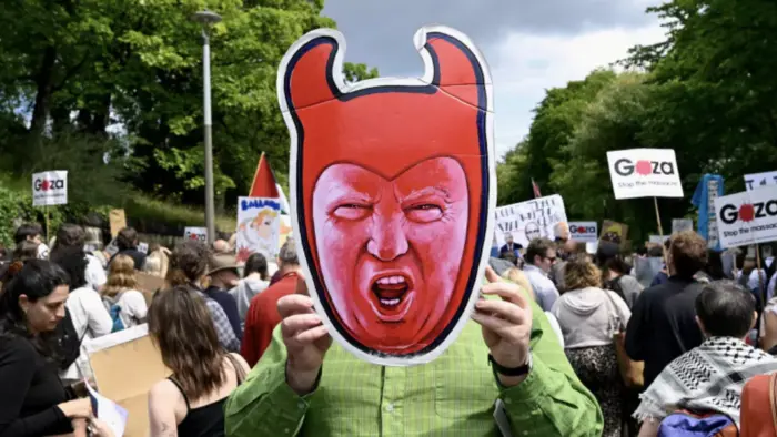 - Um manifestante anti-Trump segura um recorte representando o presidente dos EUA, Donald Trump, durante um comício organizado pelo grupo de campanha “Stop Trump Coalition”, protestando contra a visita de Trump, em Edimburgo, Escócia, Grã-Bretanha. Foto de arquivo: Lesley Martin/Reuters