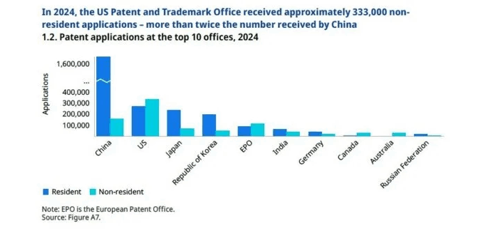 Desde 2015, o país ultrapassou a marca de 1 milhão de registros anuais e agora se aproxima rapidamente dos 2 milhões. O USPTO aparece em segundo lugar, com 603.194 pedidos, seguido por Japão (306.855), Coreia do Sul (246.245) e o Escritório Europeu de Patentes (EPO), com 199.402.
