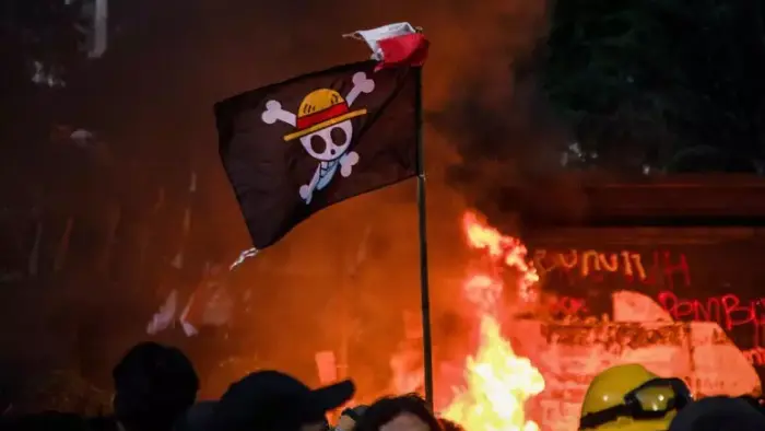 - Bandeira de One Piece vira símbolo de protestos da ‘geração Z’. Caveira usando chapéu de palha apareceu em atos na Ásia. Foto: ANSA/AFP